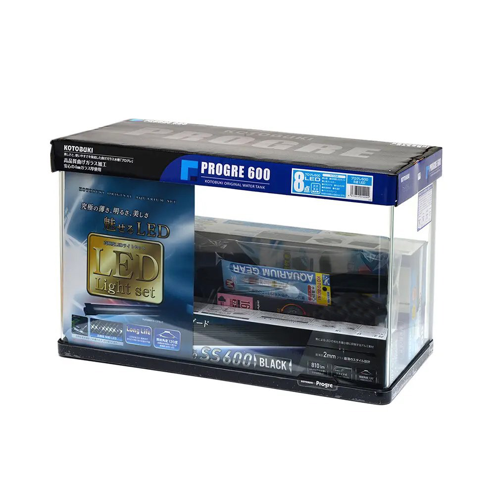 60cmフレーム付きガラス水槽:「コトブキプログレ600」(ガラスフタ1枚つき)、LED照明:コトブキフラットLEDSS600ブラック、上部式フィルター:コトブキスーパーターボトリプルボックス600、ヒーター:コトブキツーウェイオートMD160W、バックスクリーン(ブルー・ブラックリバーシブル※パッケージなし)、水温計、飼育の手引き