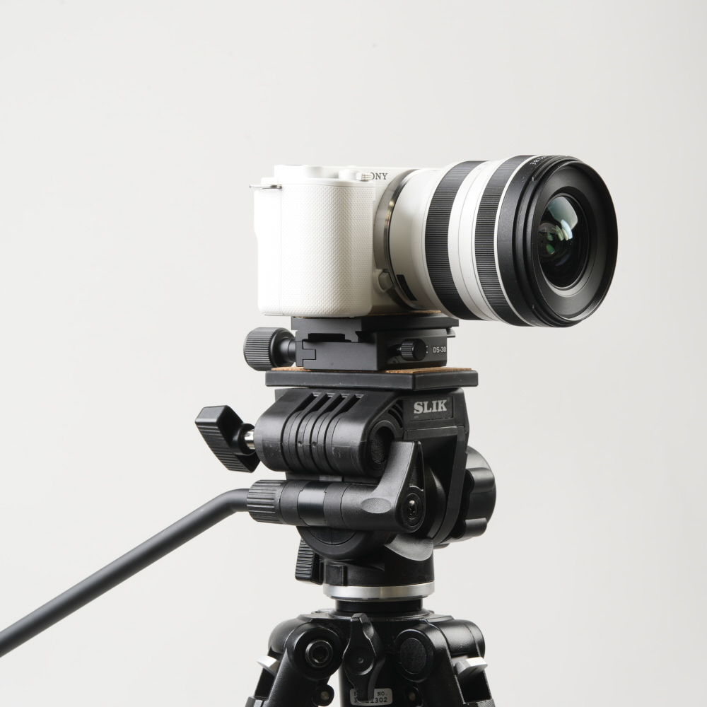 バーチカルビデオヘッドは、縦長のビデオカメラに対応するクイックシュープレートを採用しています。そのため、レンズが当たる場合があります。その時は別売のクイックシューアダプターDS-30を取り付ければレンズが当たらずに使えます。