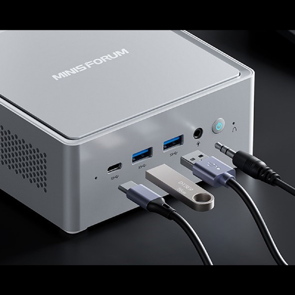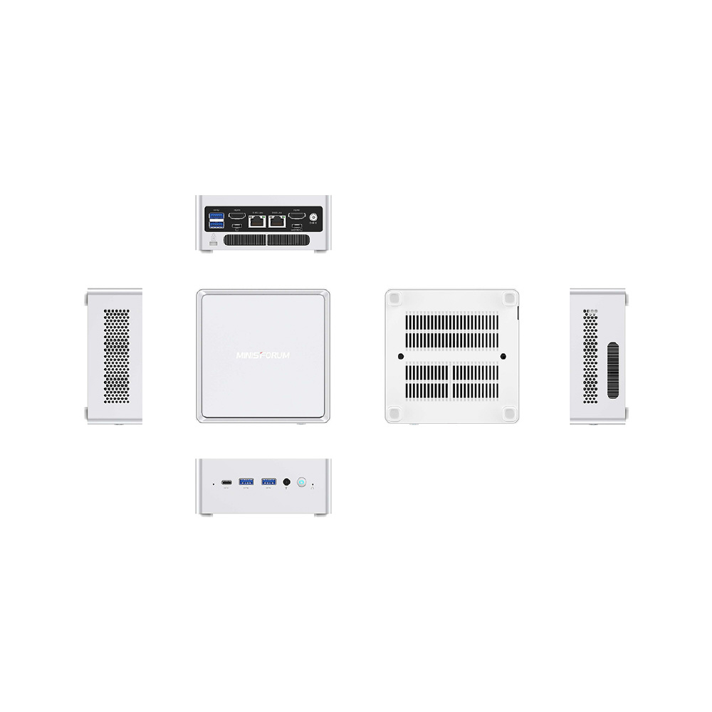 MINISFORUM NAB5Rは、Intel第13世代のCPU、Core i5-13500Hを搭載した高性能ミニPCです。12コア16スレッド、最大4.7 GHz動作の高性能CPUと16〜32 GBの大容量メインメモリ、512 GB〜1 TB M.2 NVMe 高速SSDを搭載することで画像や動画編集なども快適に行えます。HDMIとUSB-C端子を組み合わせて最大4画面同時出力が可能なため、最小限のスペースでマルチモニタ環境の構築にも対応します。