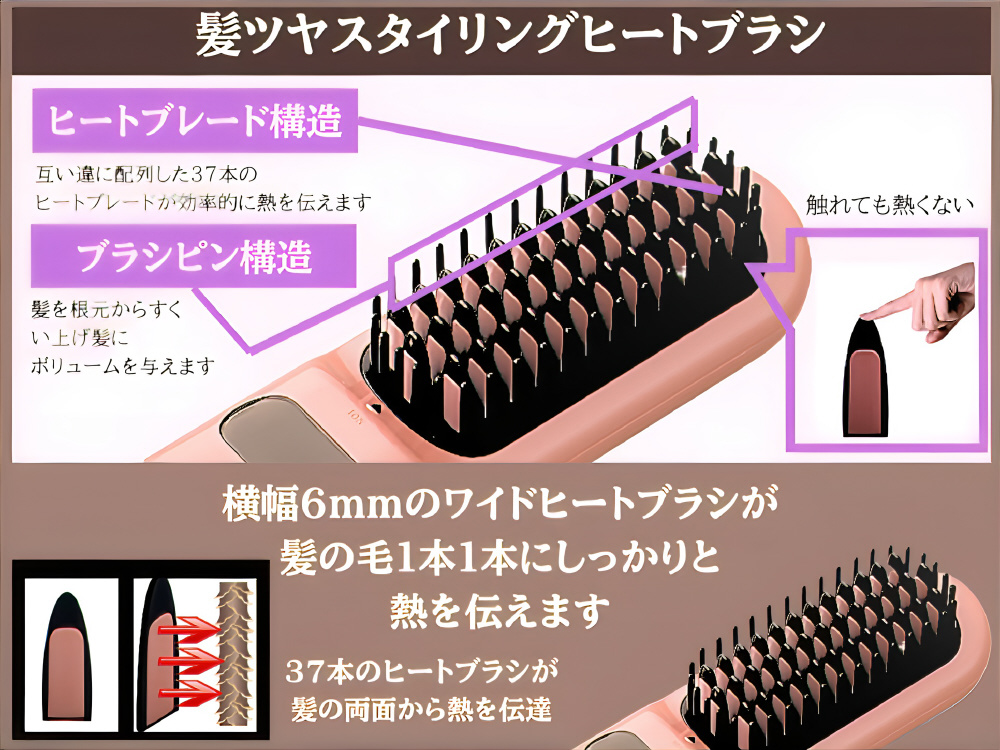 ■互い違いに配置した6ミリ幅の37本のヒートブレードで、まんべんなく髪に熱を加え、髪にツヤを与えながら素早くスタイリングできます。またヒートブレードは、頭皮に触れても熱くなりにくいよう周りを耐熱樹脂で覆っています。