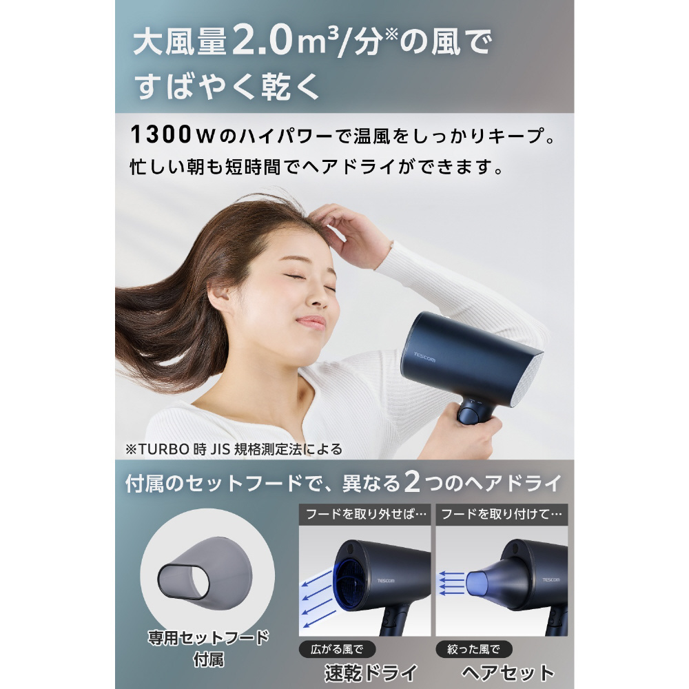 温風をしっかりキープし、大風量2.0m3/分の風で髪をすばやく乾かせるので、忙しい朝も時短でヘアドライができます。