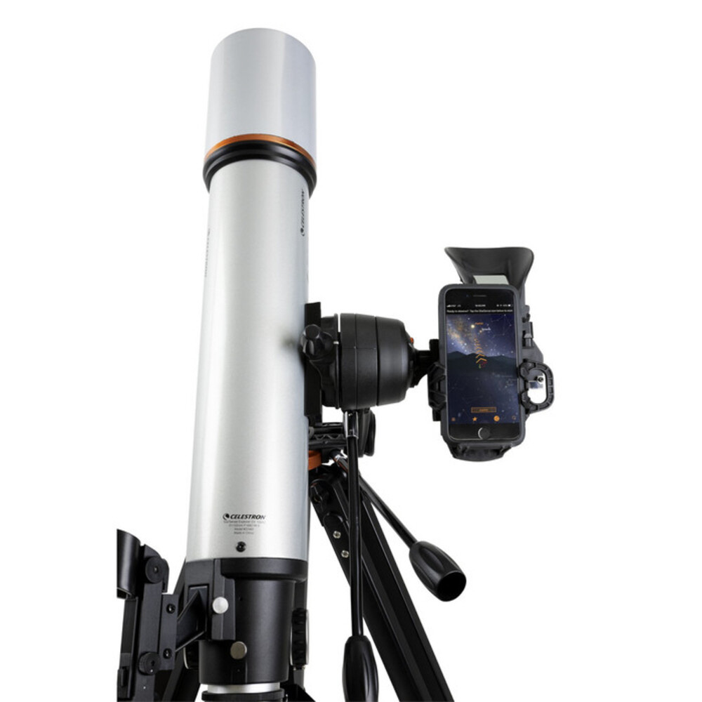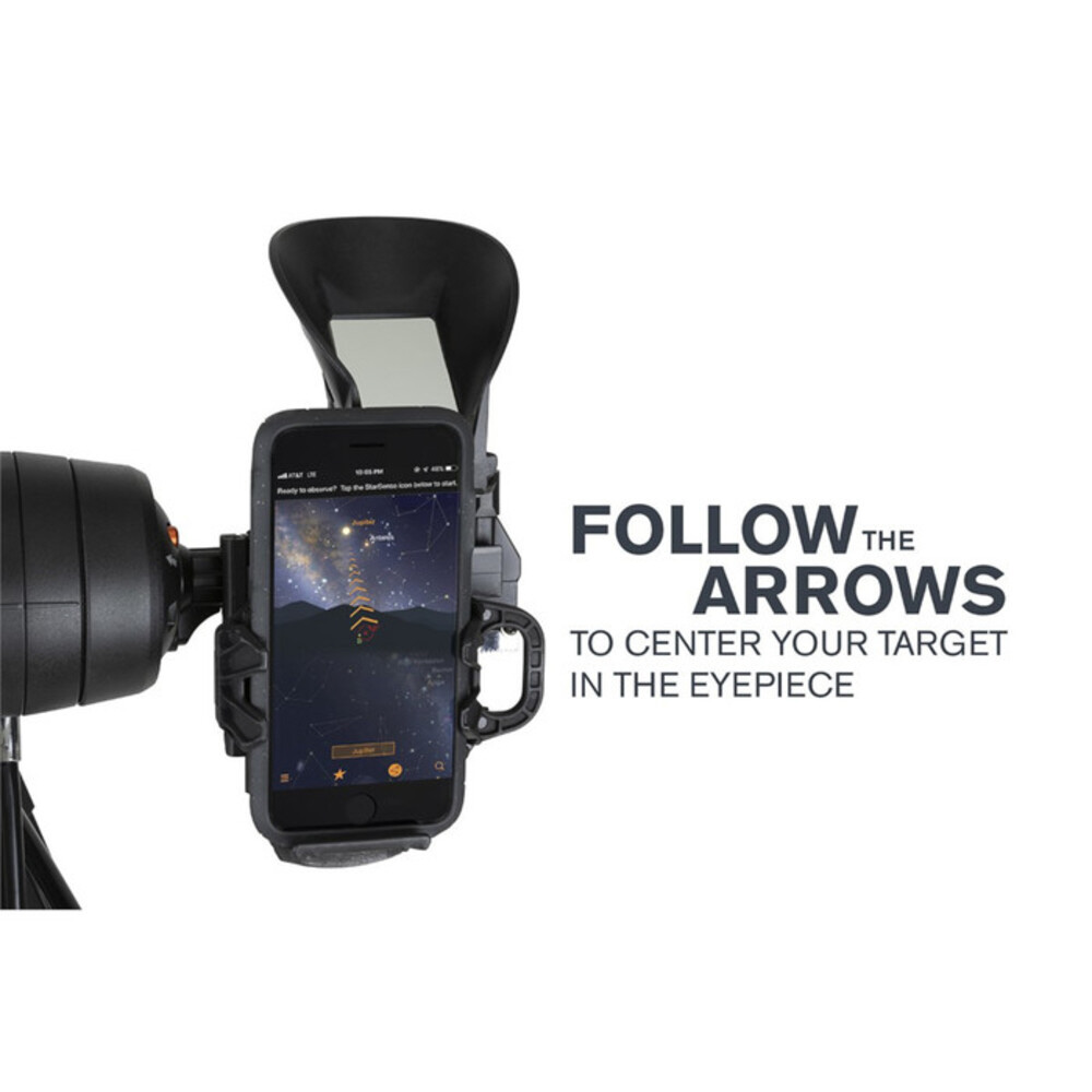 StarSense Explorerシリーズ望遠鏡に付属のスマートフォンホルダーにスマートフォンをセットし、専用アプリを起動します。