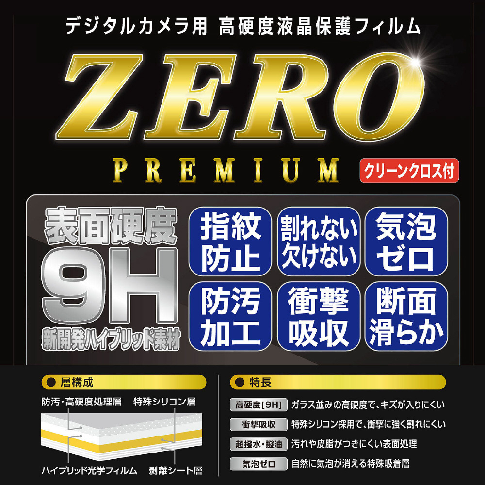 ガラスと変わらない硬度9Hと、フィルムのしなやかさを両立するハイブリッド素材を採用。ガラスに匹敵する硬度で傷付きにくい高硬度9Hコーティング処理。皮脂・指紋が付きにくい、超撥水・撥油処理。ベースはしなやかで、鮮やかな画面を維持する光学フィルム。薄型でタッチ性が良い。一定の衝撃吸収性により、フィルムの割れを防止する特殊シリコン層。気泡が入りにくく、自然に気泡が抜けるエアーレスタイプ。液晶保護フィルムを選ぶ際には、HAZE値(ヘイズ=曇度)が重要です。ガラスは0%、ペットシートは4%程度。ZERO PREMIUMはガラスに近い0.66%です。断面が綺麗なレーザーカット加工です。