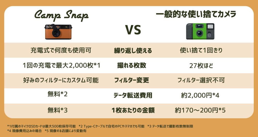 スクリーンありのカメラは画像確認や補正に気を取られがちですが、キャンプスナップなら90年代に流行した使い捨てカメラのように今 この瞬間や体験に集中して画面を見ずに思い出が残せます。