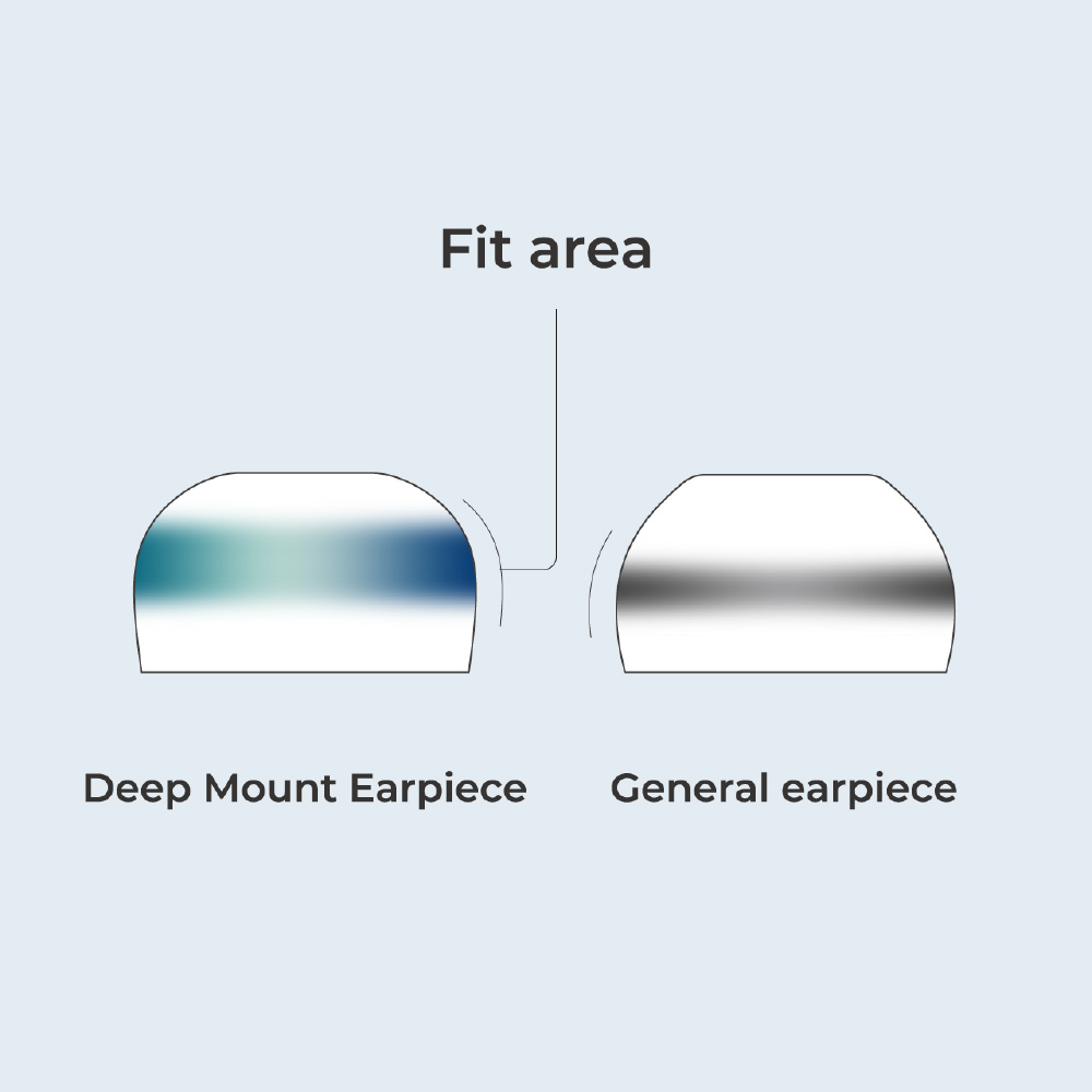一般的なイヤーピースと比較して耳のより奥の広いエリアでフィットする独自形状により密閉性が向上。