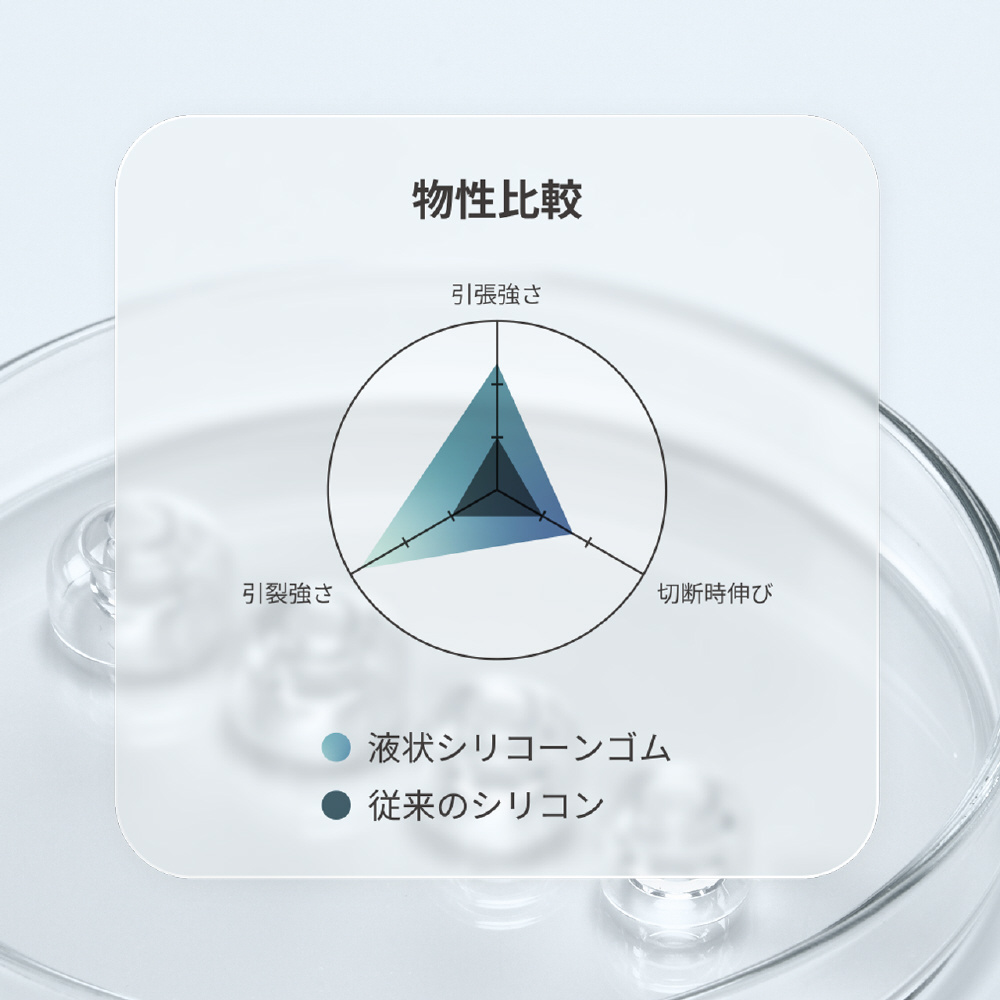 さらに、FDA(アメリカ) およびLFGB(ドイツ) が定める医療機器や食品などの安全基準に準拠した生体適合性の高いメディカルグレードの安全性(※) を備えており、デリケートな肌質の方でも安心してご使用いただけます。