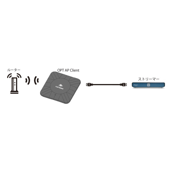 無線通信は、常時処理や再送制御などの負荷が高く、オーディオ機器には不要なノイズの要因となります。OPT AP Client を使えば、無線でネットワークに接続しながら、ストリーマー側は有線で使用でき、音質的に有利です。