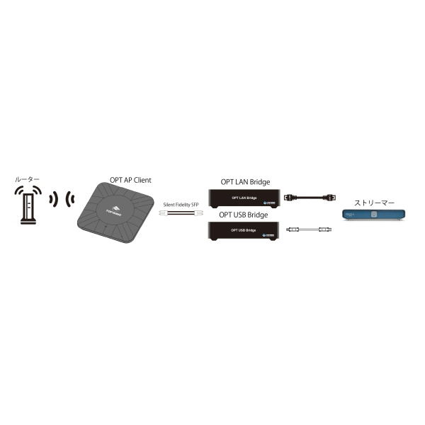 OPT AP Client には SFP ポートが搭載されているため、Silent Fidelity SFP、OPT LAN Bridge/USB Bridge との組み合わせで、簡単に無線->光->有線という高いアイソレーション構成へ発展できます。電気的なノイズ経路を断ち、より静かなネットワーク伝送が可能になります。