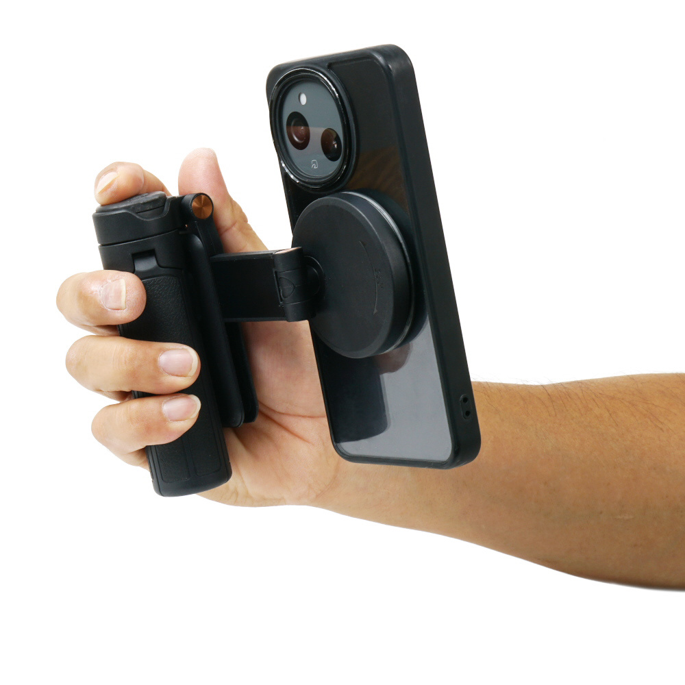 スマートフォン用のグリップ、テーブル三脚として、マルチに使えます。マグネットホルダーにより、iPhone12以降のMagSafeに対応した機種、 Pixel 10以降のPixelsnapに対応した機種をワンタッチで取り付け可能。 付属のリングプレートを貼り付けることで、対象機種以外にも使えます。リモコン装備で、グリップ時にはシャッターボタンのようなイメージでも使えます。
