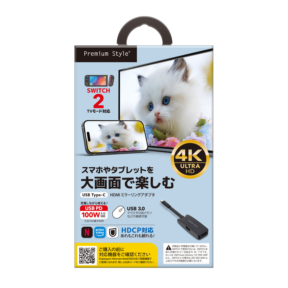 USB Type-Cポート搭載のスマートフォンやタブレット、SWITCHの画面をTVに転送できるUSB Type-Cコネクタ HDMIミラーリング アダプタです。USB Type-Cポートを搭載したスマートフォンやiPadなどのデバイスの映画、テレビ番組、ユーチューブ、ゲーム、オーディオ、写真、ビデオ、アプリケーション、Web サイトなどをHDMIポートを搭載したテレビ、モニターに最大4096×2160/60Hzの4K/ULTRA HD解像度で表示する事ができます。また、著作権保護機能(HDCP)対応により多くのアプリをお楽しみ頂けます。USB 3.0規格のUSB-Aポート搭載でUSBマウスやメモリも使用可能です。SWITCH 2/SWITCH/SWITCH(有機ELモデル)に対応し、ゲーム画面をTVに映し出す事が出来ます。デバイスとテレビを繋ぐだけの簡単接続設計で、ミラーリング中も充電が可能です。PD100W対応(PCへの出力は最大60W)※パソコンやスマートフォン、SWITCHをTVやモニターに接続する際は、本製品と別途HDMIケーブルが必要です。※対応デバイスはUSB Type-Cポート搭載でDisplay Port Alternate Mode(ディスプレイポート オルタネートモード)対応機種に限ります。※著作権保護機能(HDCP)について:端末やTVがHDCPに対応している必要があります。機種やアプリによってはミラーリングができない場合があります。※SWITCHで使用するには、SWITCH本体に同梱されている純正のACアダプタ、もしくはUSB Power Delivery 15V対応/40W以上、SWITCH 2の場合は20V対応/60WI以上出力できる充電器が必要となります。※SWITCH使用時はミラーリングではなく、TVモードとなります。SWITCH本体の画面は消灯します。