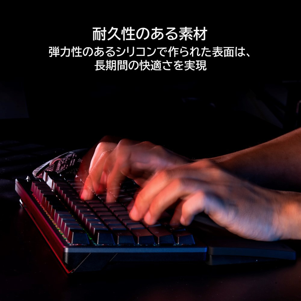 人間工学に基づいたROGキーボードリストレストは、耐久性のあるシリコン製で、ROGロゴがエンボス加工されています。