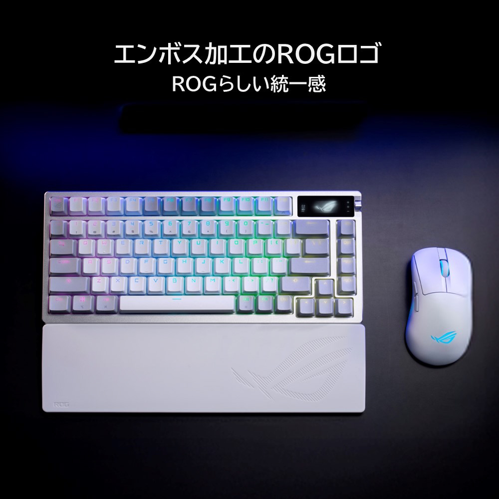 人間工学に基づいたROGキーボードリストレストは、耐久性のあるシリコン製で、ROGロゴがエンボス加工されています。