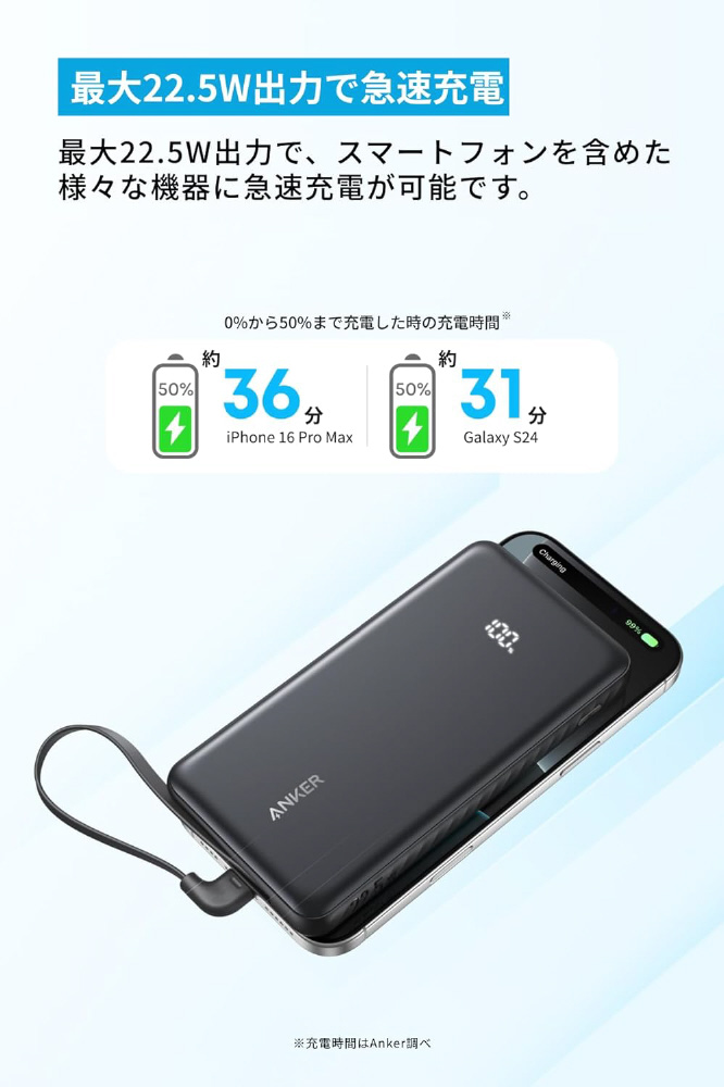 最大22.5W急速充電:最大22.5W出力で、スマートフォンを含めた様々な機器に急速充電が可能です。