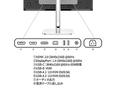 ■インターフェイスはHDMI2.0 x1 (60Hz)、DisplayPort1.4 x1 (60Hz)とUSB-C x1 (60Hz/最大65W給電)を装備し、様々な機器との接続が可能です。USB-C(最大65W給電)は、対応のPCであればUSB-Cケーブル1本でモニターへの映像出力とノートPCへの給電が可能。ケーブル1本でスッキリ接続出来るだけでなく、テレワーク、出社併用の場合などノートPCのACアダプターを持ち運ぶ必要が無くなります。