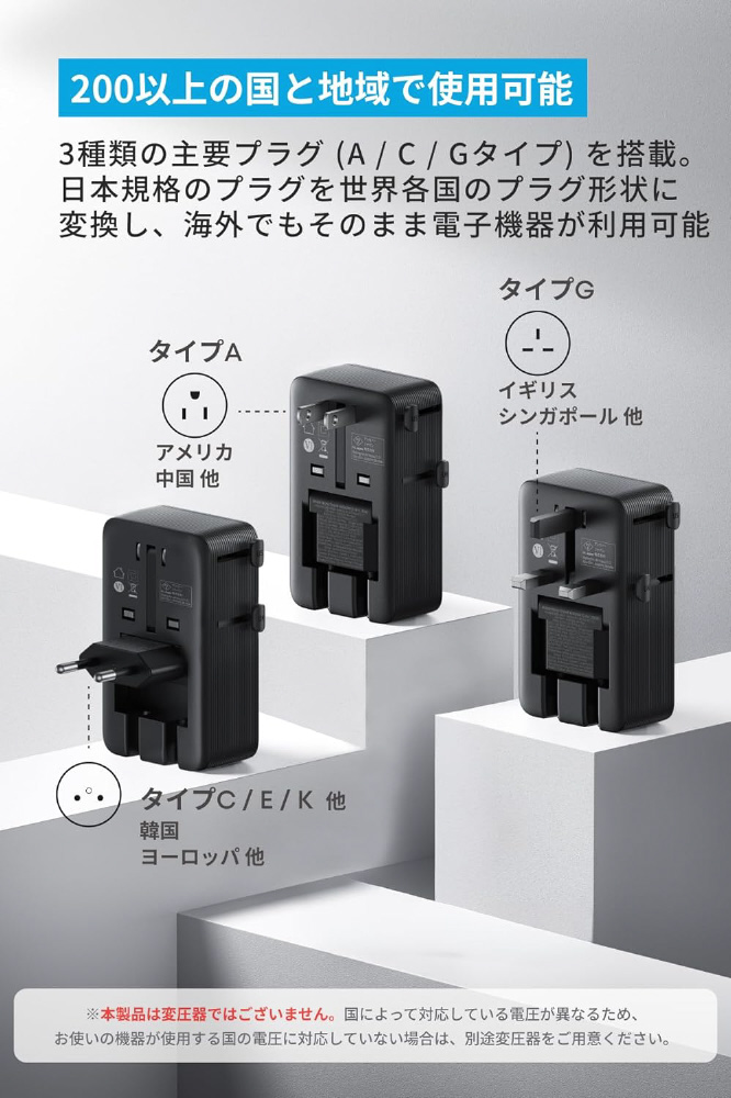 海外の200以上の国と地域で使用可能な3種類の主要プラグ(A・C・Gタイプ)を搭載。海外旅行や海外出張など、さまざまな場面での電源利用に対応しています。 (※本製品には変圧機能はありません。ご使用の機器が100?240V対応であることを必ずご確認ください。)
