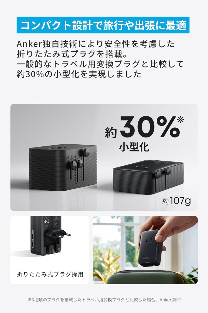 Anker独自技術により安全性を考慮した折りたたみ式プラグを搭載。一般的なトラベル用変換プラグと比較して約30%の小型化を実現しました
