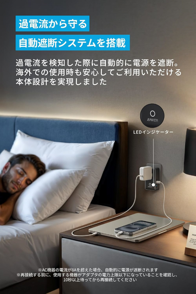 過電流を検知した際に自動的に電源を遮断。海外での使用時も安心してご利用いただける本体設計を実現しました ※AC機器の電流が8Aを超えた場合、自動的に電源が遮断されます※再接続する前に、使用する機器がアダプタの電力上限以下になっていることを確認し、10秒以上待ってから再接続してください