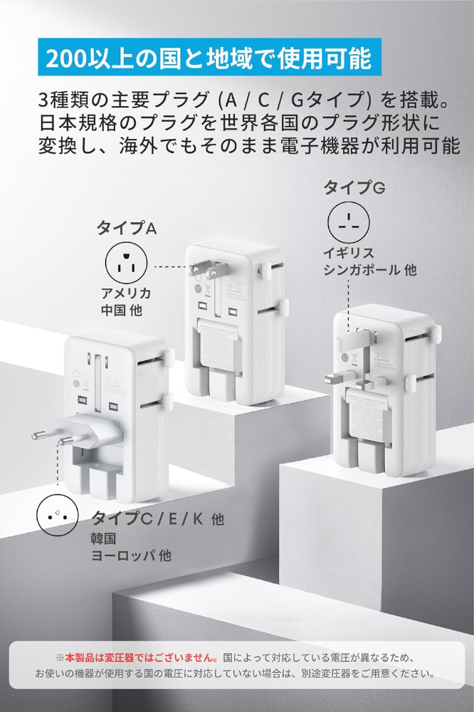 海外の200以上の国と地域で使用可能な3種類の主要プラグ(A・C・Gタイプ)を搭載。海外旅行や海外出張など、さまざまな場面での電源利用に対応しています。 (※本製品には変圧機能はありません。ご使用の機器が100?240V対応であることを必ずご確認ください。)