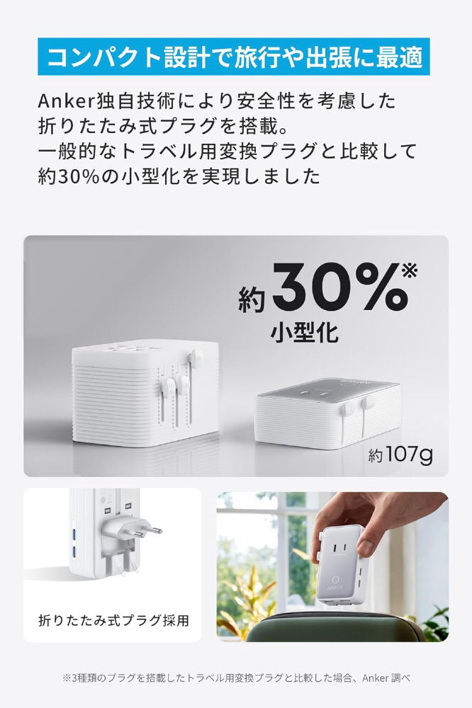 Anker独自技術により安全性を考慮した折りたたみ式プラグを搭載。一般的なトラベル用変換プラグと比較して約30%の小型化を実現しました