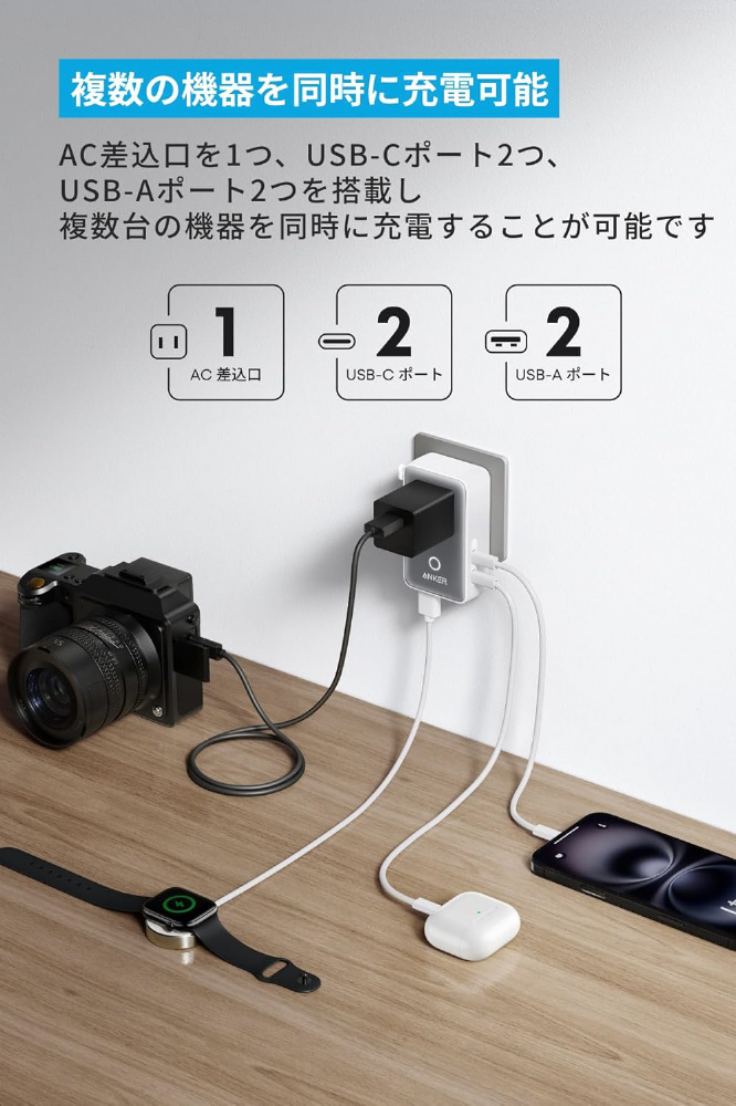 本体サイズ:約86 × 50 × 25 mm 本体重量:約107g、入力:日本:100-125V~, 50 / 60Hz, 8A イギリス / イタリア:230V~, 50 / 60Hz, 8A、出力:単ポート利用時:USB-C1:5V?3A / 9V?2.22A / 12V?1.67A (Max20W) USB-C2:5V?3A (Max15W) USB-A1 / A2:5V?2.4A (Max12W)、2ポート / 3ポート / 4ポート利用時:合計Max15W
