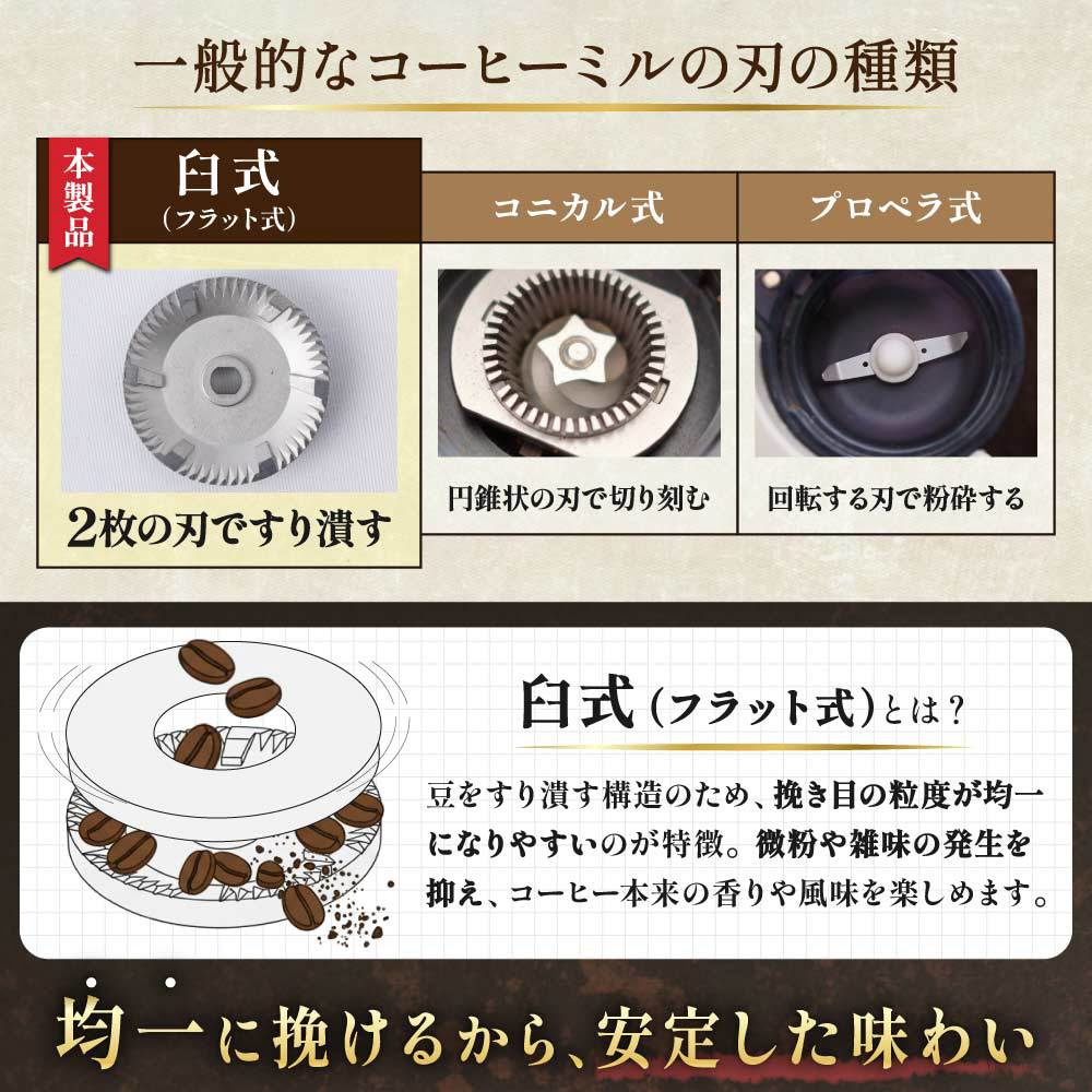 挽いたときの粒度が均一になりやすく、香りや風味を最大限に引き出すことができます。