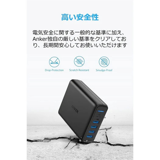 ほぼ全てのUSB-C機器へPower Delivery対応USB-Cポートからのフルスピード充電が可能です(MacBookへ最大30W出力での充電が可能)。iPhone 13 / 13 Pro / 13 mini / 13 Pro MaxやiPad Pro (2018, 11インチ) / MacBook / MacBook Air (2018) への急速充電も可能です。前モデルのAnker PowerPort+ 5 に比べ、傷や汚れの目立ちにくいマットテクスチャ加工を施し、使いやすさ・安全性が向上しました。