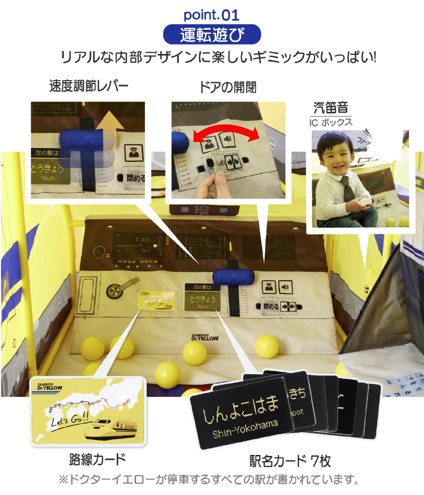 ●923形ドクターイエローがボールテントになりました。運転あそびや検測あそび、ドクターイエローにまつわる豆知識カードなど楽しいギミックがいっぱい!家族で楽しめる停車駅のすごろくゲームつき!