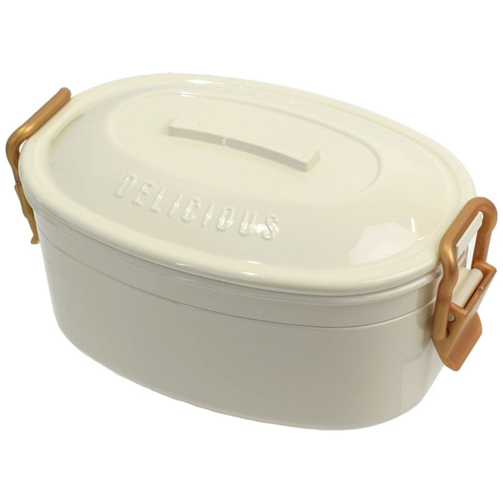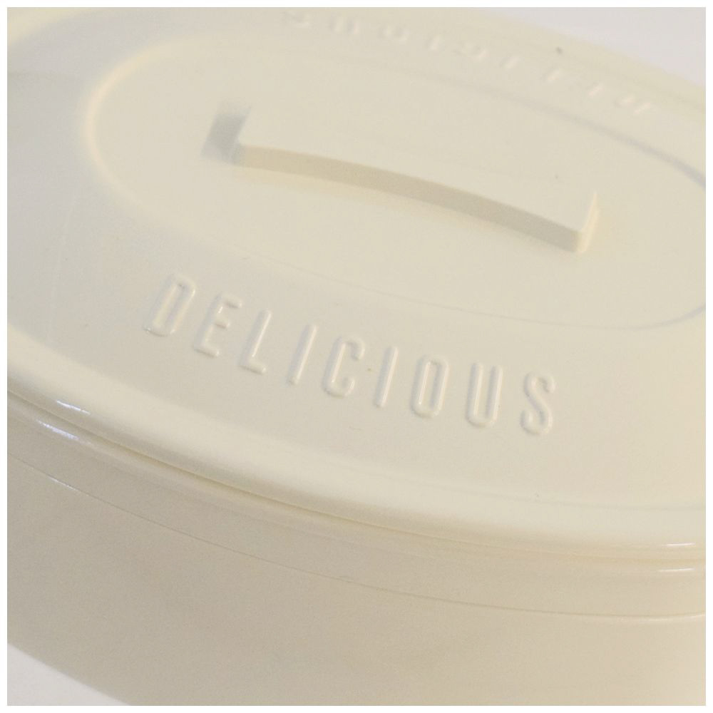 ■「DELICIOUS」の刻印とつやっとした塗装が印象的な2段ランチボックス。