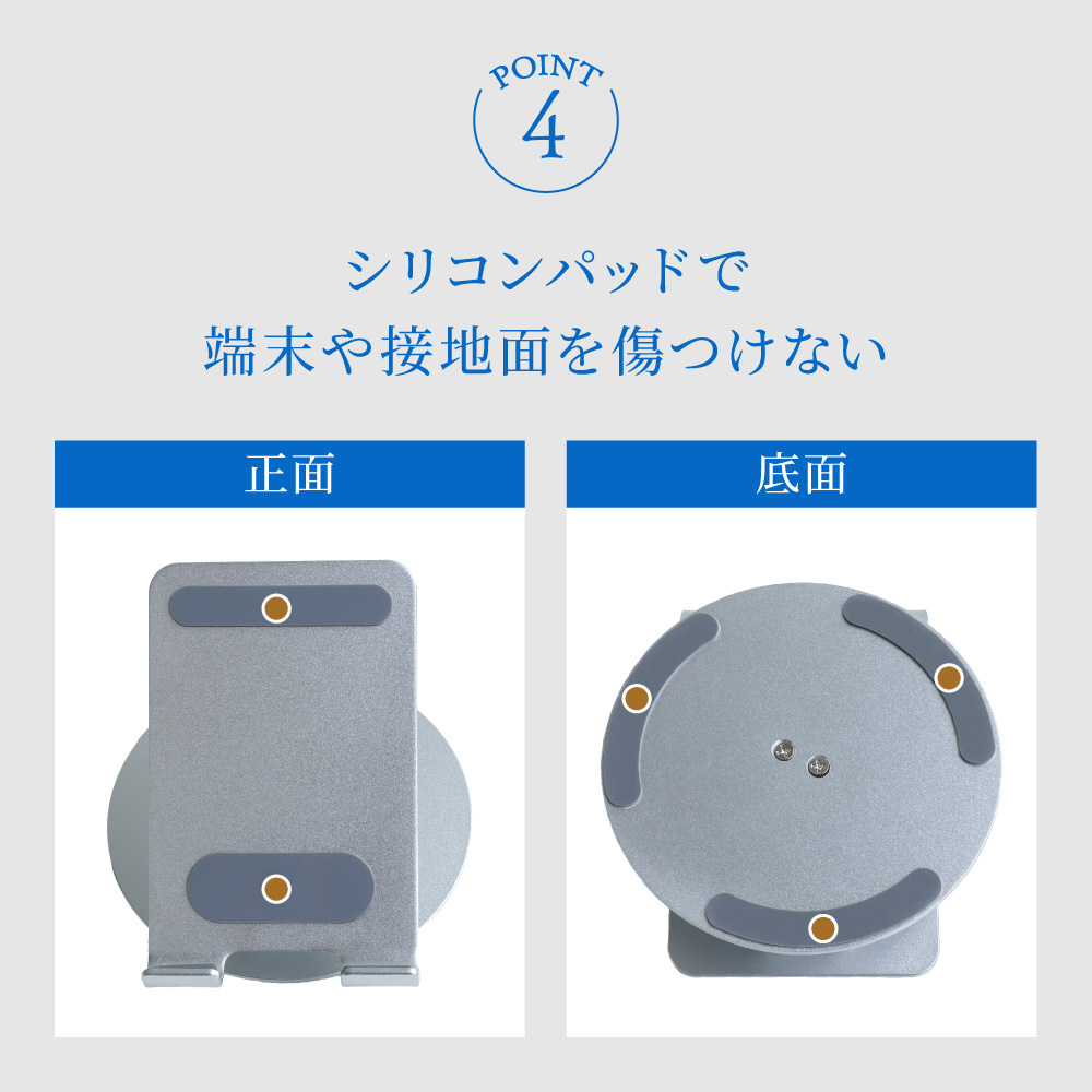 シリコンパッドが機器やデスクへのキズを防ぎ、設置時の振動を減らすことでより安定感がアップします。