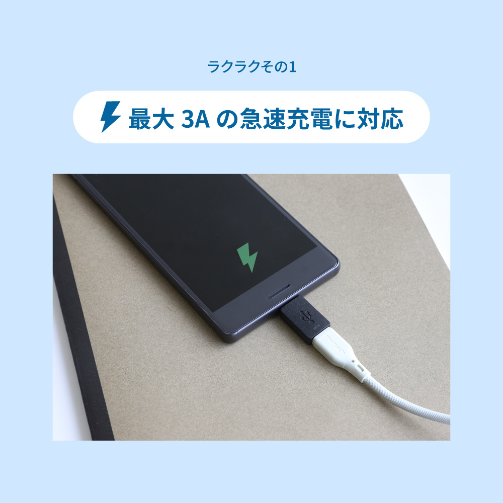 スマートフォンやタブレットなどをAC充電器やモバイルバッテリーなどに接続して、最大3Aでの充電が可能です。