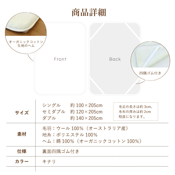 素材 毛羽:ウール100%、地糸:ポリエステル100%、ヘム:綿100%(オーガニックコットン100%)