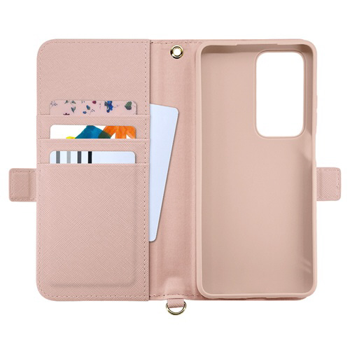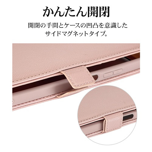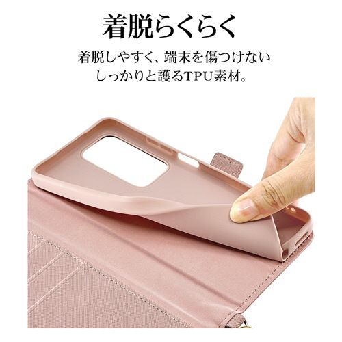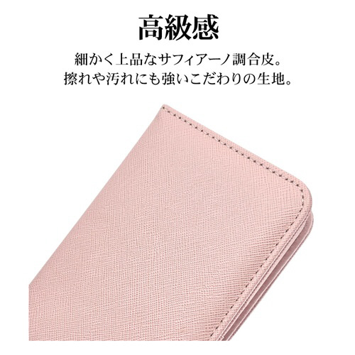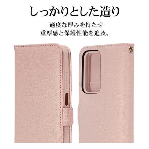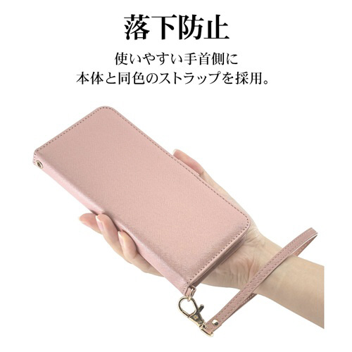 液晶画面側と背面側の両面を保護できるハンドストラップ付きの手帳型ケースです。