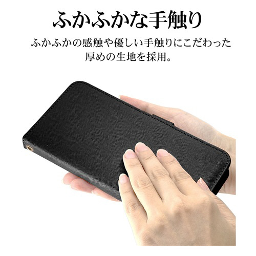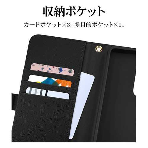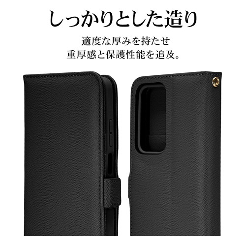 液晶画面側と背面側の両面を保護できるハンドストラップ付きの手帳型ケースです。