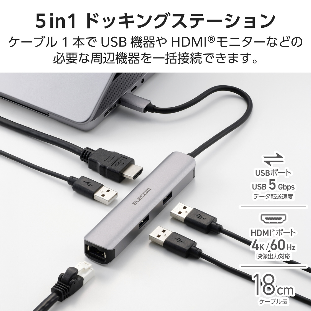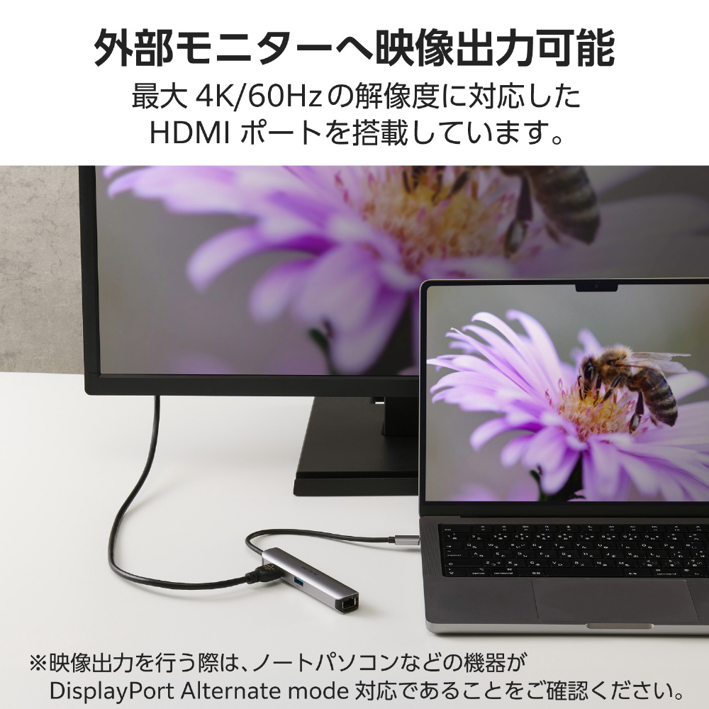 USB Type-C(TM)ポート搭載パソコンに、ケーブル1本でさまざまな周辺機器を一括で接続できるドッキングステーションです。HDMI(R)で最大4K60Hzの高画質映像を出力しながら、USB機器や有線LANも同時に使用できるので、デスク周りの配線をすっきりまとめることができます。