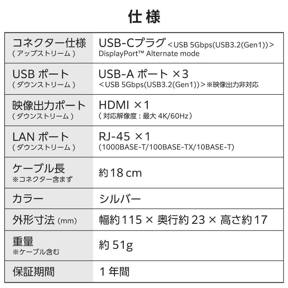 [USB-C オス→メス HDMI / LAN / USB-Ax3] ドッキングステーション シルバー DST-052BPSV