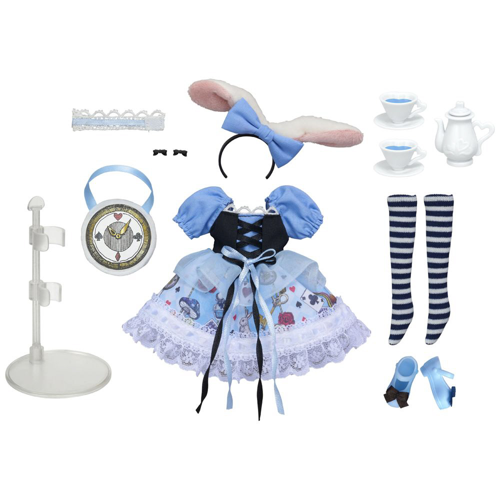しましま模様のハイソックス、リボンのついたクツ、バッグ、ティーセットが付属します。