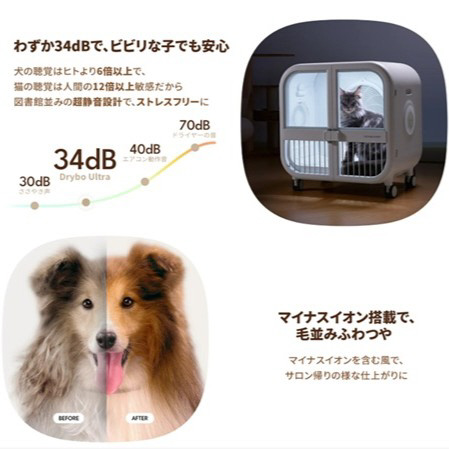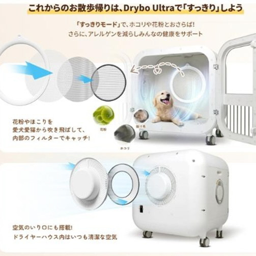 世界で既に50万台以上が愛用、大好評のDryboシリーズ最大容量135?の大型サイズ。床からの優しい風で、乾きづらかったおなかやしっぽ、足先までマイナスイオンで毛並みふわふわツヤツヤに乾燥させます。6つの安全装置で、大事な家族のペットを守ります。標準フィルターの他に、更に花粉吸着フィルターも付属となりました。