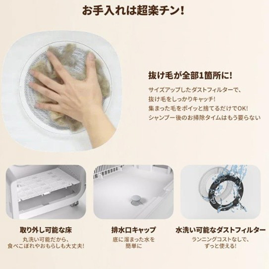 ご使用後、底に溜まった水は床を取り外して、排水口キャップを開ければ簡単に排水できます。その後、湿らせた布で拭いて頂ければスッキリきれいです。また抜け毛も、背面のダストフィルター付き排気口に集まりますので、素早く簡単に片付ける事ができます。(本体の水洗いはできません)