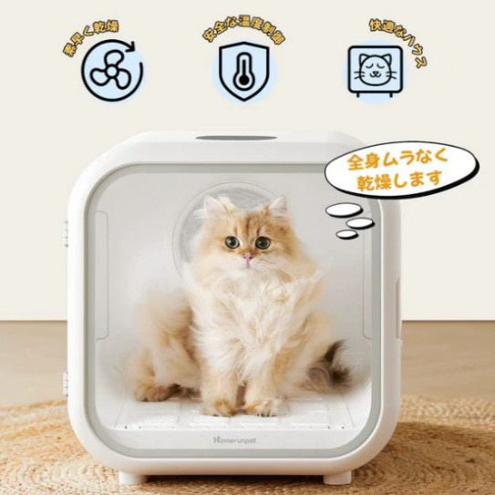 全世界で既に50万台以上が愛用されるペット用ドライヤーハウス。床からの優しい風で、乾きづらかったおなかやしっぽ、足先までマイナスイオンで毛並みふわふわツヤツヤに乾燥させます。