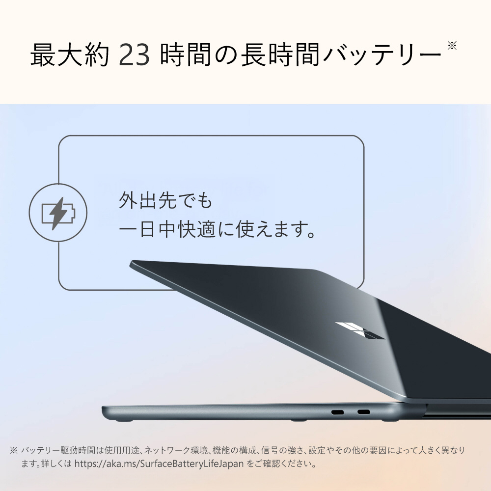 USB-C 3.2/Thunderbolt 4 対応 USB-C × 2(充電、データ転送、DisplayPort 1.4a) Surface Laptop 13 インチ は、最低60Wの充電器を使用することで急速充電可能※ USB-A 3.1 3.5mm ヘッドフォン ジャック ※急速充電は、60W以上のUSB Type-C充電器(別売り)でサポートされています。2025年3月にMicrosoftによってテストが実施されました。
