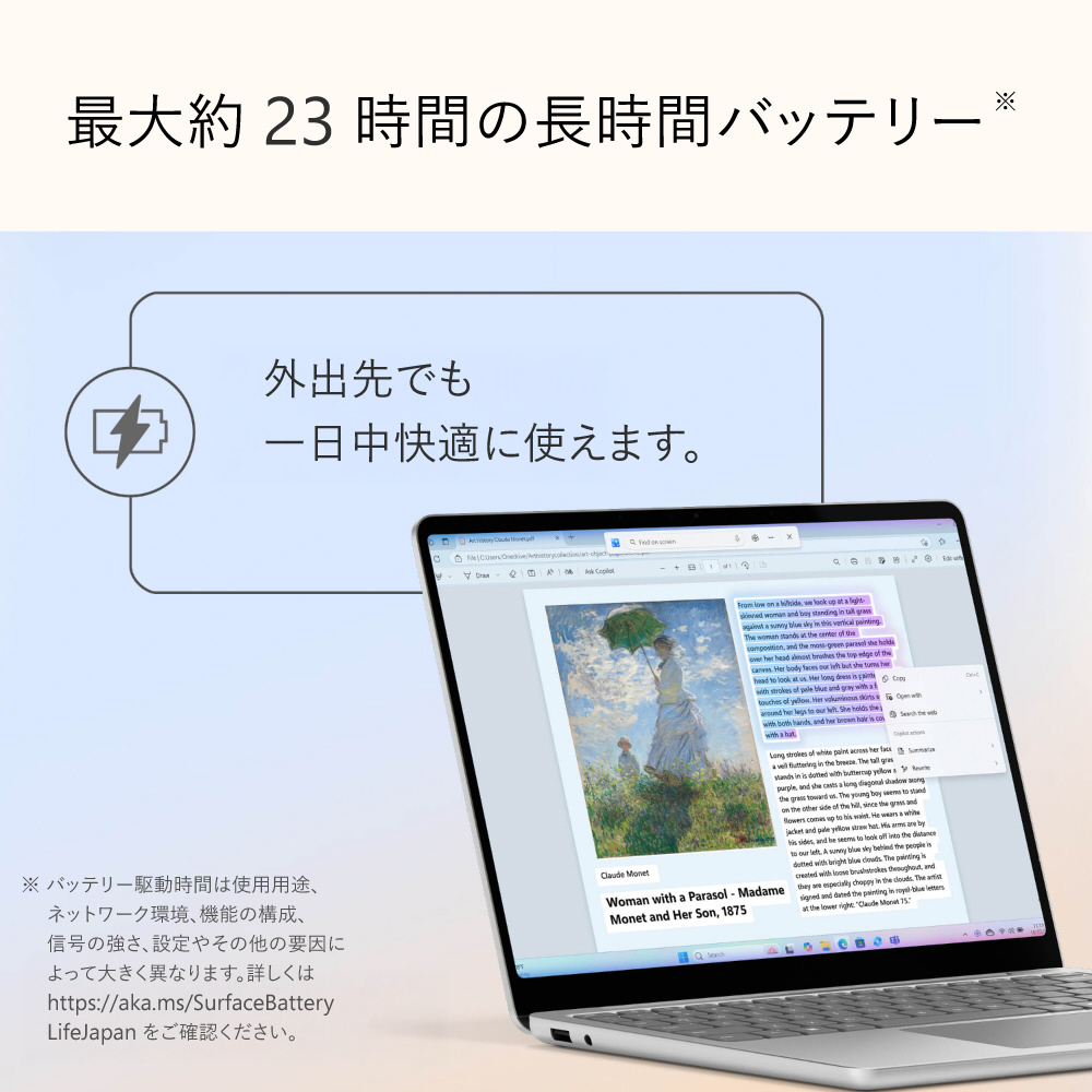[ディスプレイ] 13 インチ PixelSense ディスプレイ 1920 x 1280 (178 PPI) 最大リフレッシュレート 60Hz カラー プロファイル:sRGB、Enhanced コントラスト比:1000:1 輝度:SDR:最大400nits(標準) カラーキャリブレーション ディスプレイ Adaptive Color Adaptive Contrast 強化ガラスディスプレイ 縦横比:3:2 10点マルチタッチ対応