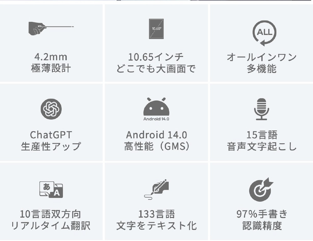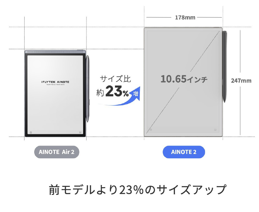 音声文字起こし×手書きノート!大画面で「極薄」「極軽」、大容量バッテリー搭載、手書きメモ・録音・文字起こしの更なる連携、AIボタン搭載、133言語の文字をテキスト化、97%の文字認識精度、書きマインドマップの作成、15言語の音声をリアルタイムでテキスト化、話者分離と会議要約、10言語の音声リアルタイム翻訳 本体サイズ:247*178*4.2mm、本体重量295g