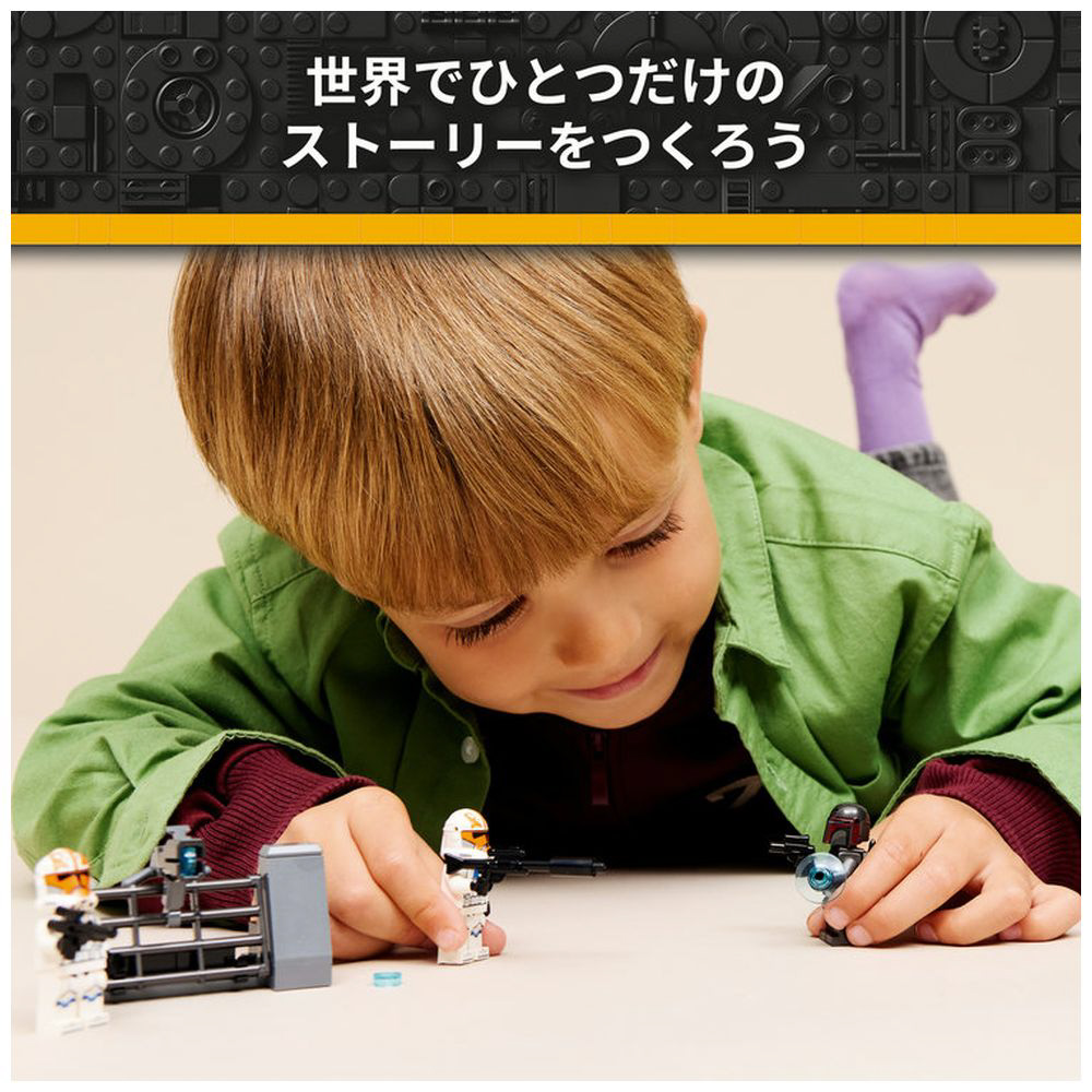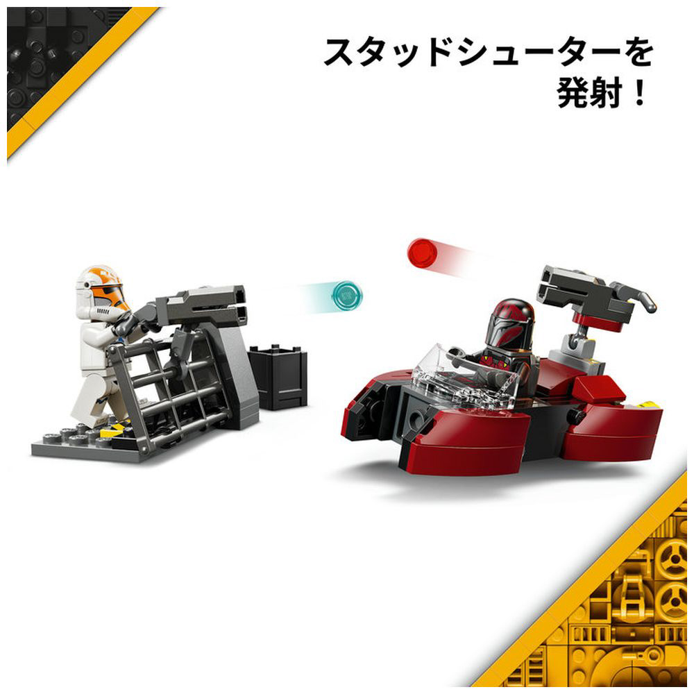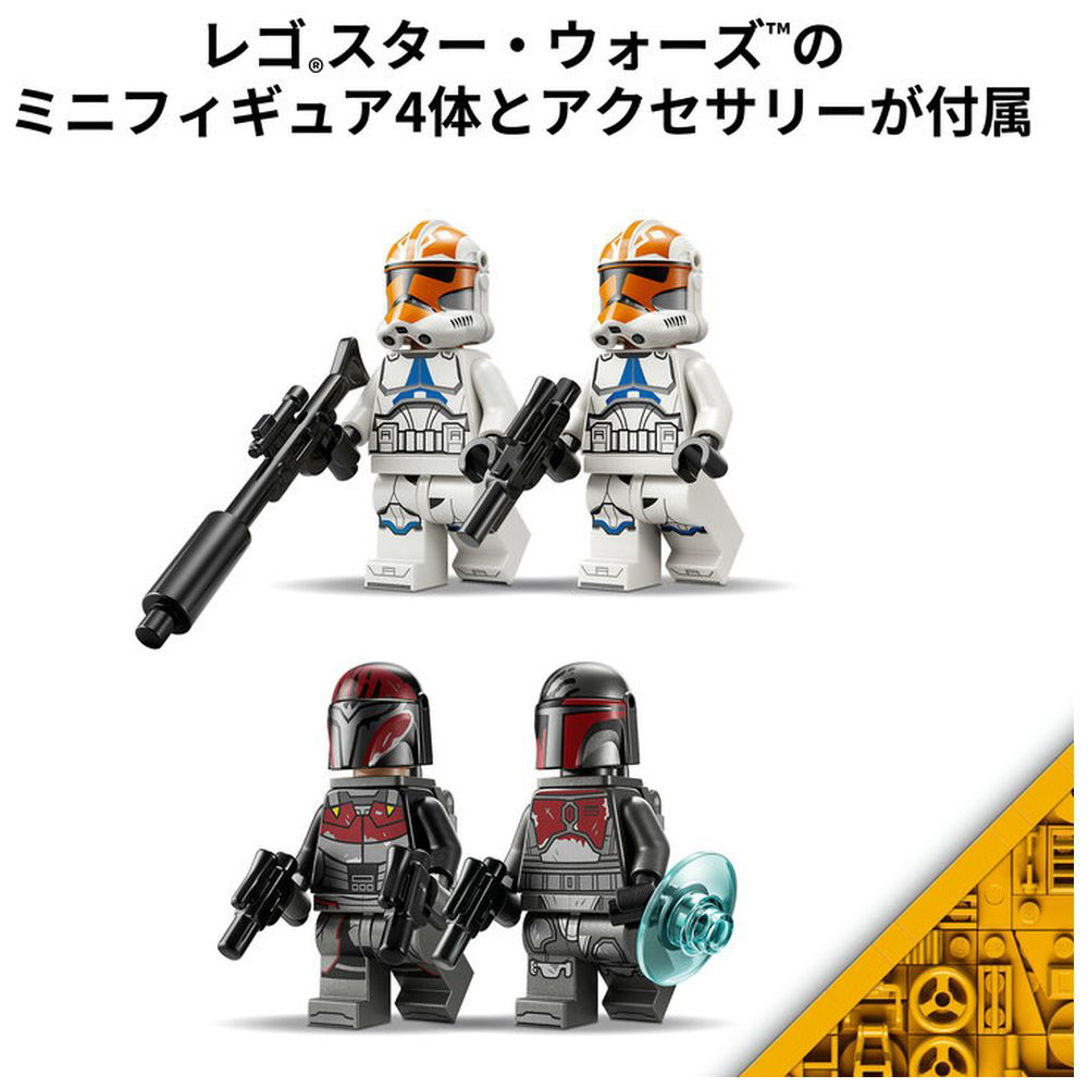 ミニフィギュア4体(「マンダロリアン・スーパー・コマンドー」2体、アソーカの第332中隊「クローン・トルーパー」2体)のほか、スピーダーやバリケード、各種アクセサリーが付属し、
