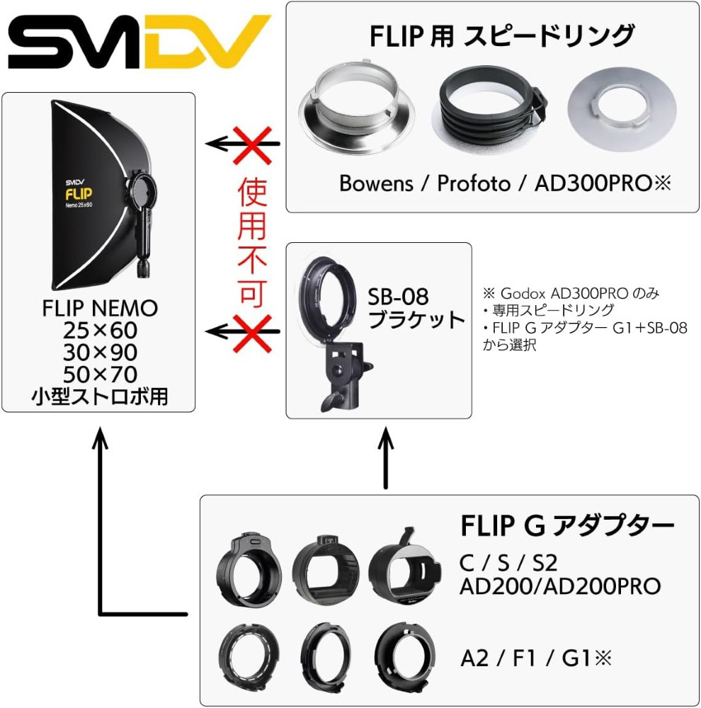 ■SMDV Flip Nemo(フリップ ネモ)は、小型スピードライト(クリップオンタイプ)専用として設計され、軽量性と取り回しを重視したラインナップです。