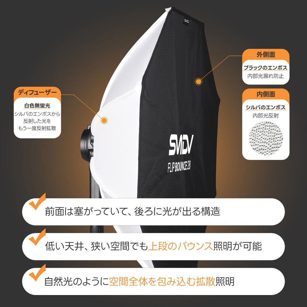 Flip機構で最短セットアップ、角度調整グリップ付きで設置も簡単。小型ストロボ用に最適化された高性能ソフトボックス。SMDV Flip Bounce 28 70cm(フリップ バウンス)