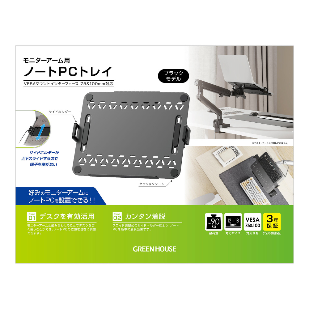 〔モニターアーム対応〕モニターアーム用 ノートPCトレイ [12〜18インチ 横幅288〜458mm] ブラック GH-NPHB-BK