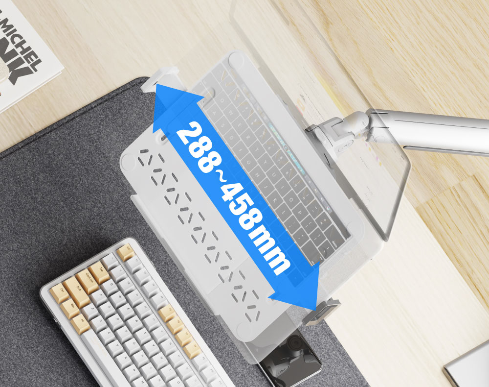 ■サイドホルダーでノートPCをしっかり固定。横幅288〜458mmのノートPCに対応します。