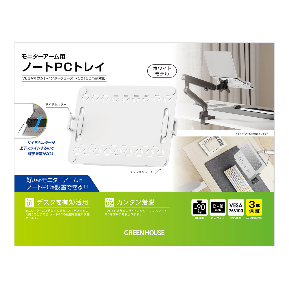 〔モニターアーム対応〕モニターアーム用 ノートPCトレイ [12〜18インチ 横幅288〜458mm] ホワイト GH-NPHB-WH
