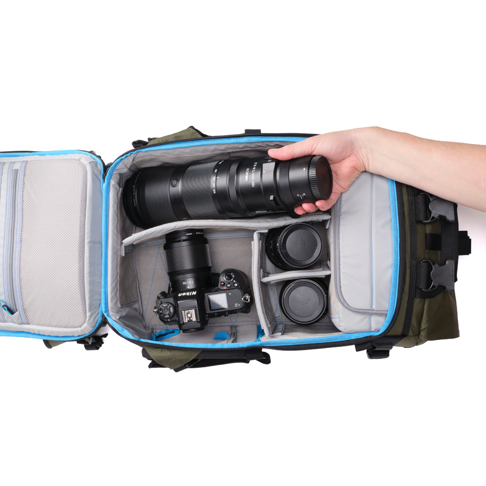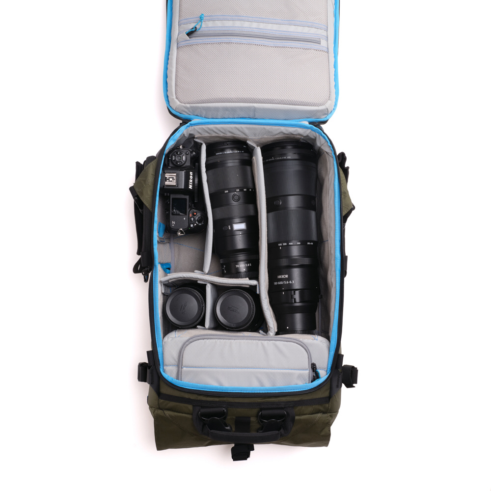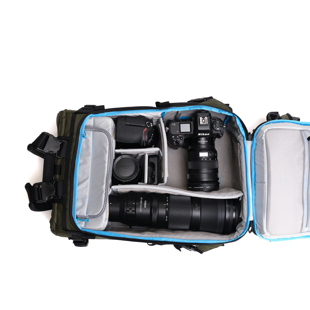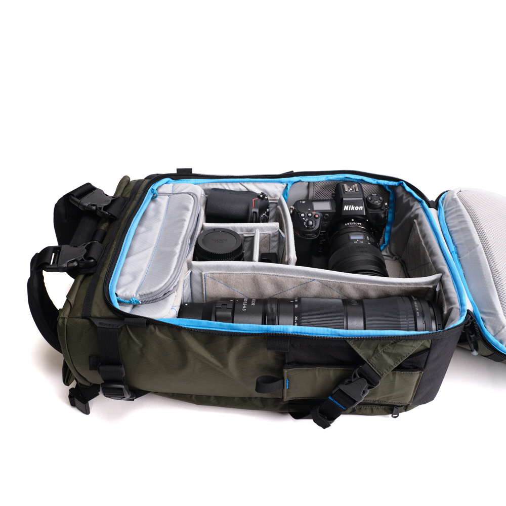 メインコンパートメントへのアクセスは背中側からで、ダブルジッパーにより大きくバックパネルが開きます。さまざまな機材収納のパターンに対応できるように充分な数のディバイダーが付属しており、ディバイダーにはオートバイのヘルメットにも採用される Artilon foam(アーティリオン フォーム)を使用し、薄型で軽量ながら耐衝撃性に優れています。