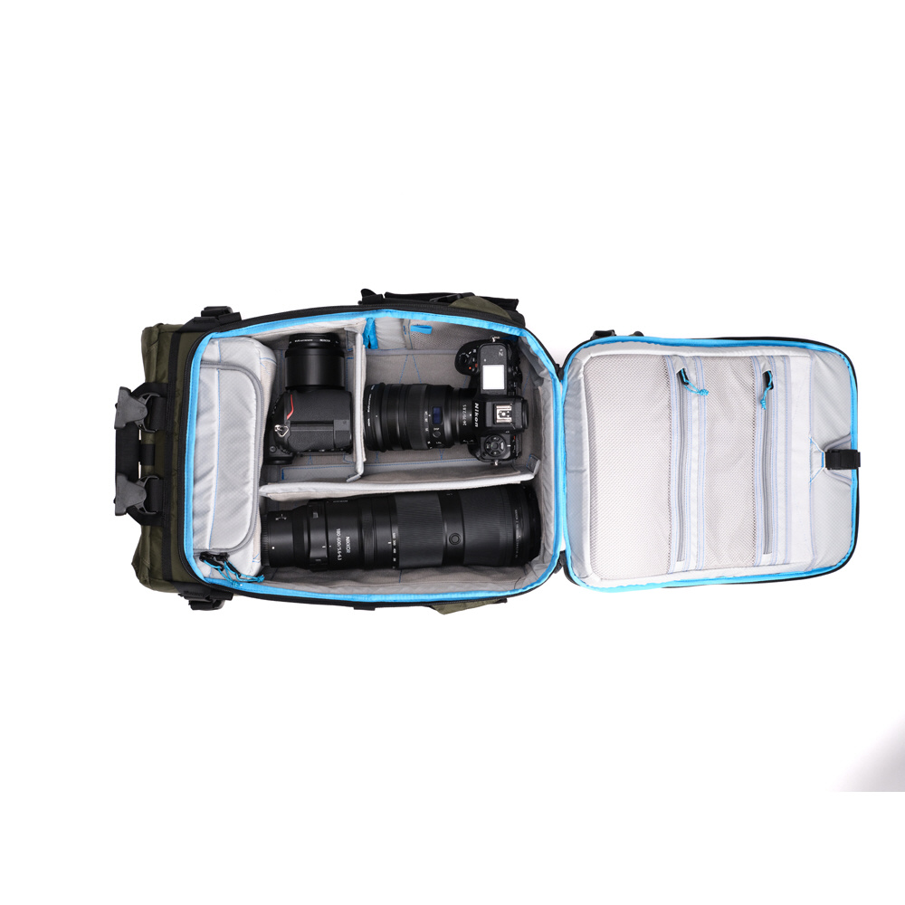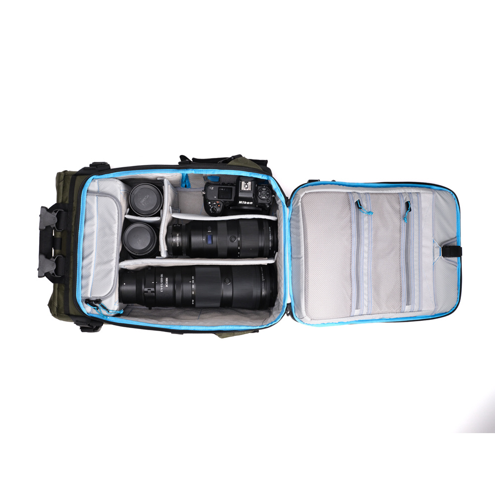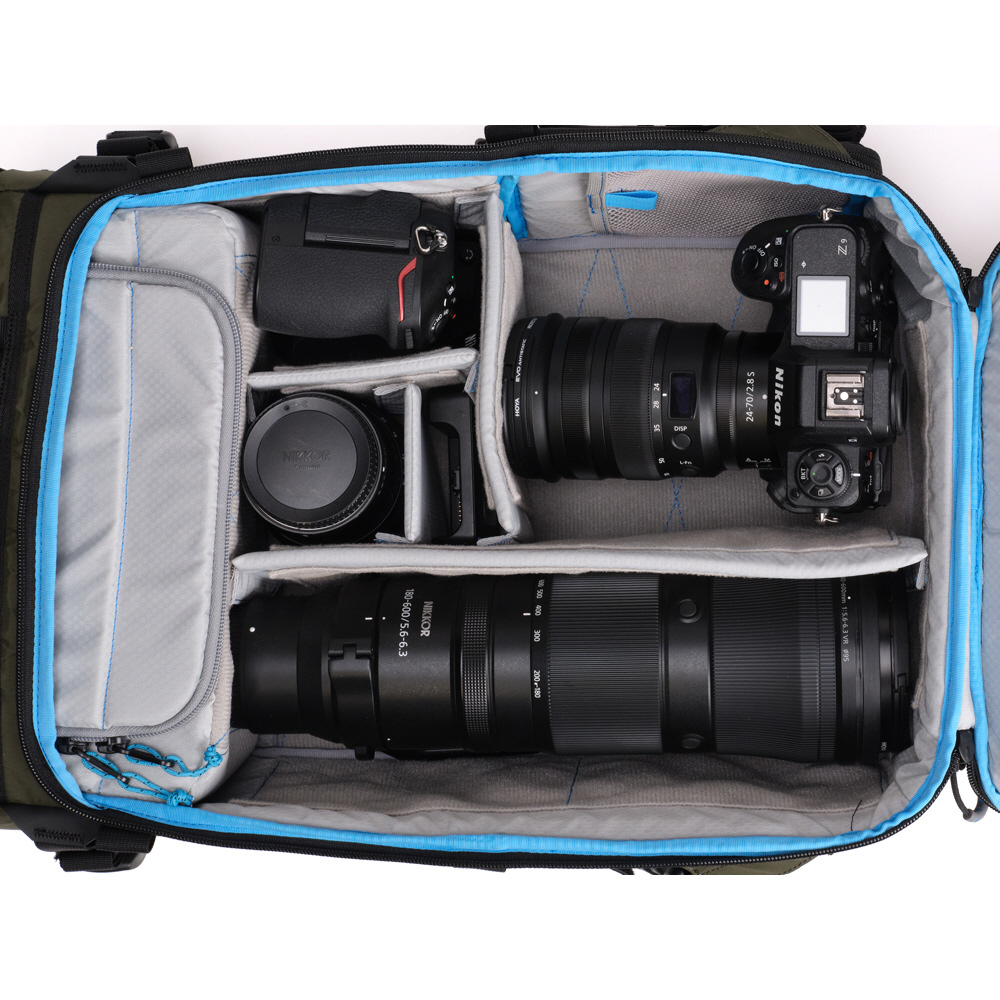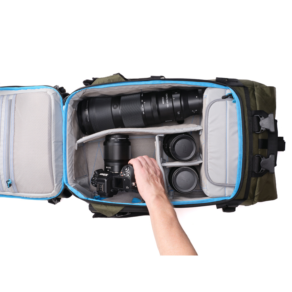 メインコンパートメントへのアクセスは背中側からで、ダブルジッパーにより大きくバックパネルが開きます。さまざまな機材収納のパターンに対応できるように充分な数のディバイダーが付属しており、ディバイダーにはオートバイのヘルメットにも採用される Artilon foam(アーティリオン フォーム)を使用し、薄型で軽量ながら耐衝撃性に優れています。
